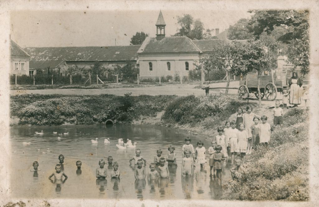 Náves v Jenišovicích - místní děti,počátek 20.století