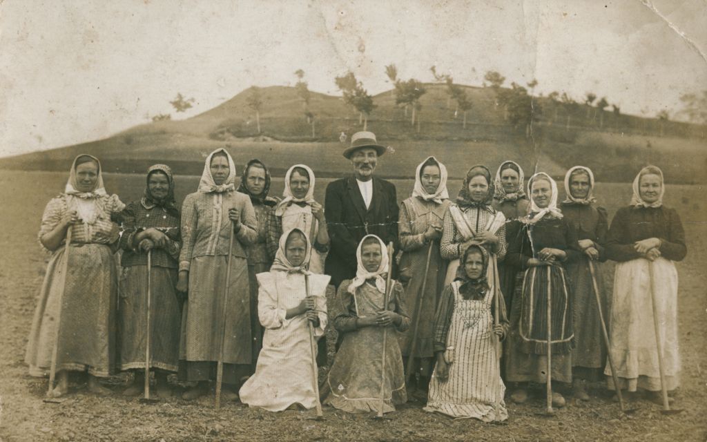 Obyvatelky Jenišovic - hromadné foto , v pozadí úpatí Jenišovického vrchu